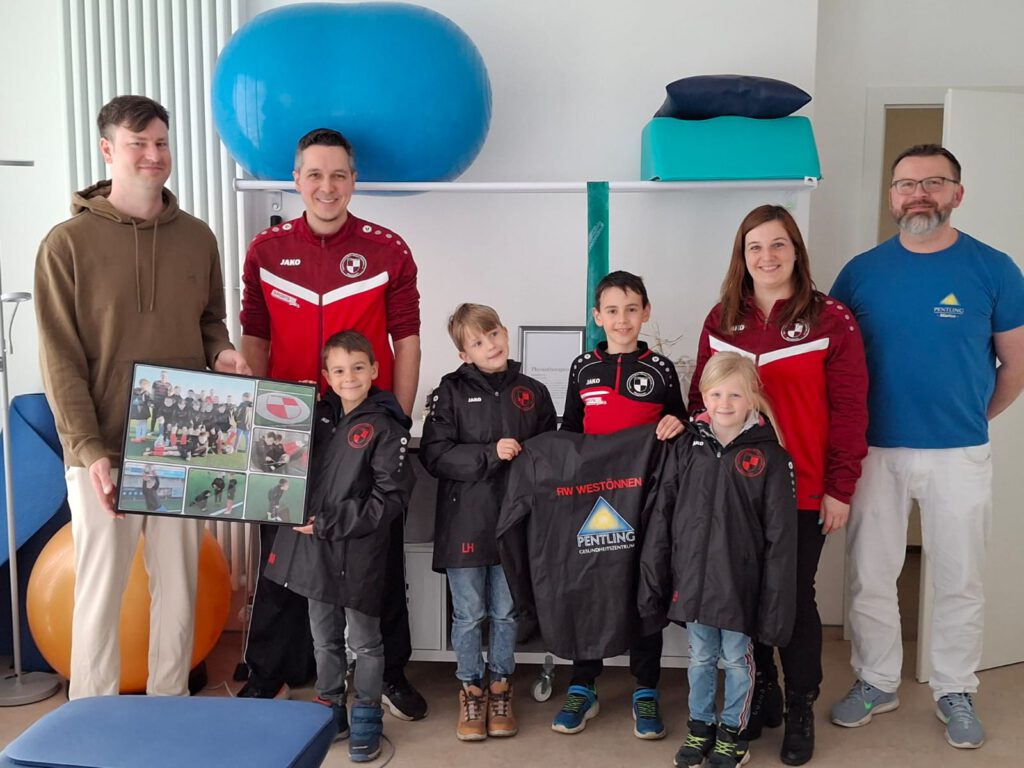 Der Anlass war jedoch keineswegs ein medizinischer Vorfall. Passend zum Wetter kamen die Kinder in ihren brandneuen Regenjacke mit den Aufdruck des Logos der Rot-Weißen und des Sponsors bekleidet in die Therapieräumlichkeiten. Auf Initiative von Marius Kaluza hin (dessen Sohn ebenfalls in der E-3 spielt) hat das Gesundheitszentrum Pentling mit seinem großzügigen Sponsoring erheblich dazu beigetragen die Anschaffung der dringend erforderlichen Regenjacken zu realisieren. Sichtlich begeistert präsentierten die Kinder die neue Ausrüstung.
