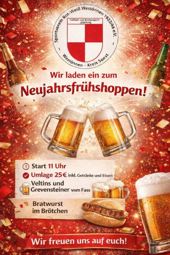 Die Fußball- und Breitensportabteilung lädt am 1. Januar 2026 ab 11 Uhr zum Neujahrsfrühschoppen ins Sportlerheim „Am Bahndamm“ ein. Für Speis und Trank ist gegen eine Umlage von 25 € p.P. gesorgt. Wir freuen uns auf Euch.